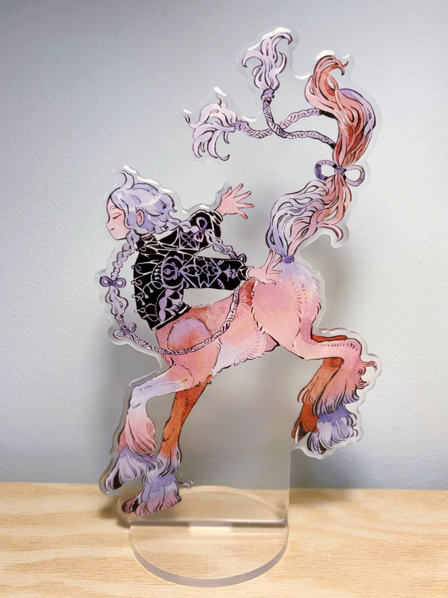 18.8cm tall Acrylic with base There are thin protective films on the acrylic that can be peeled off.